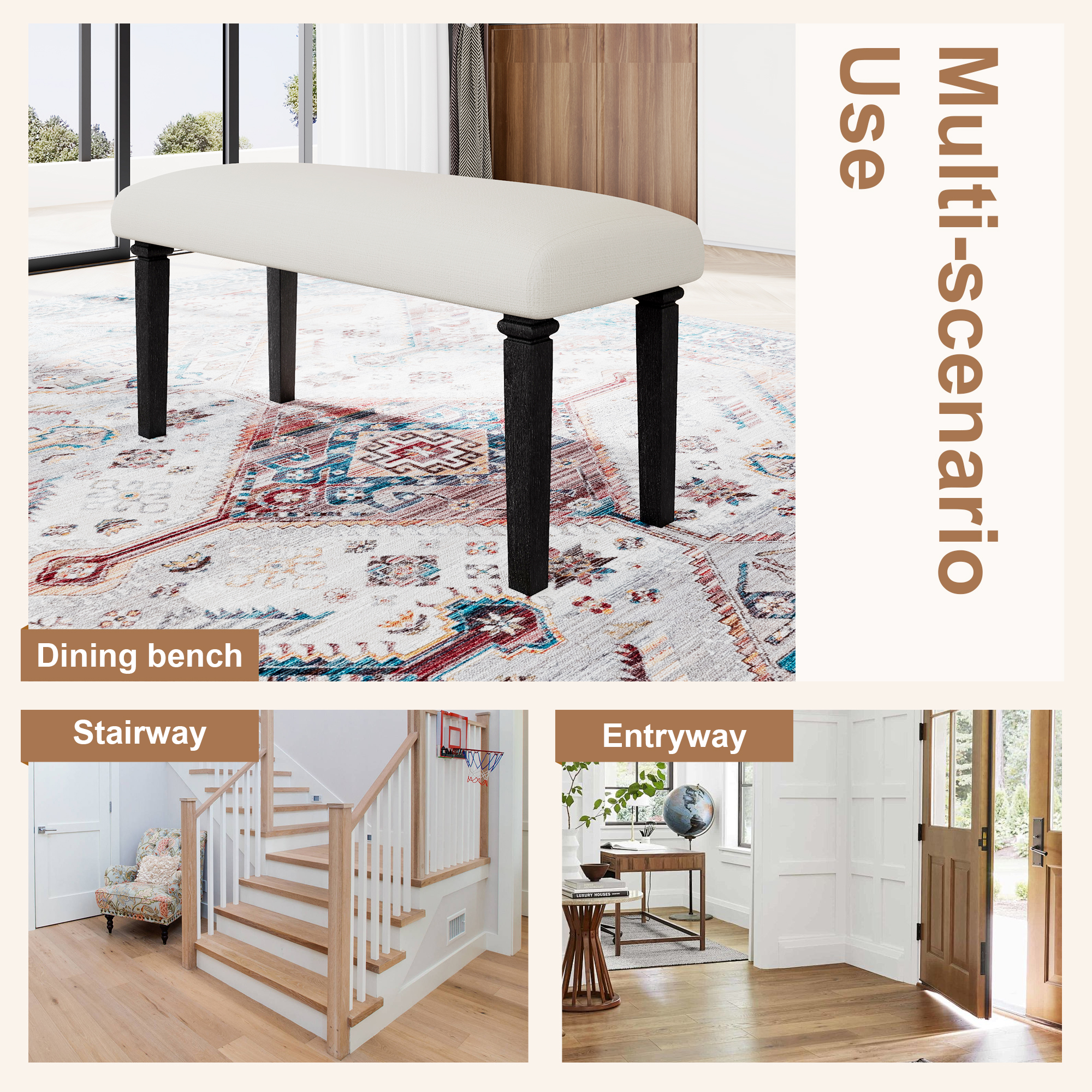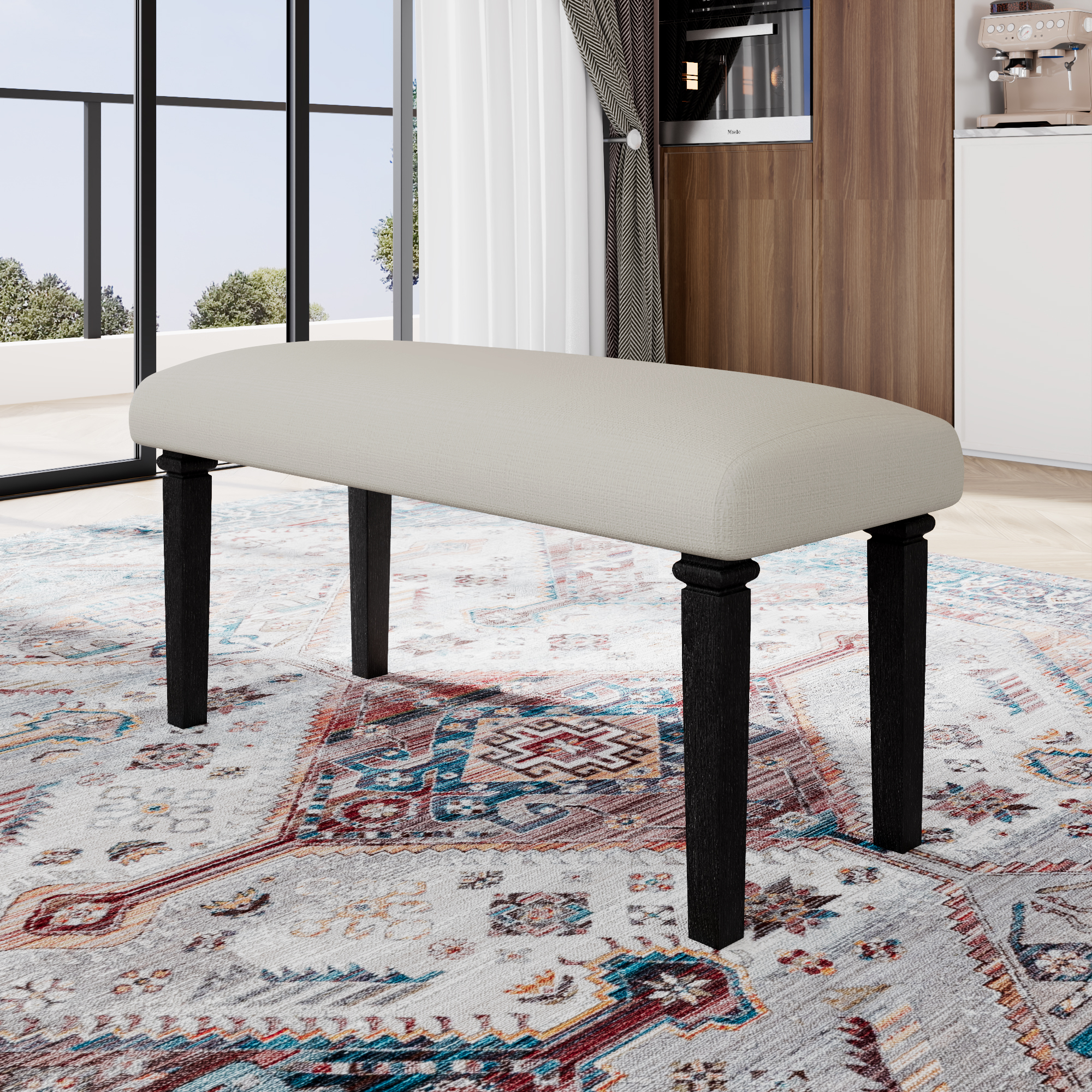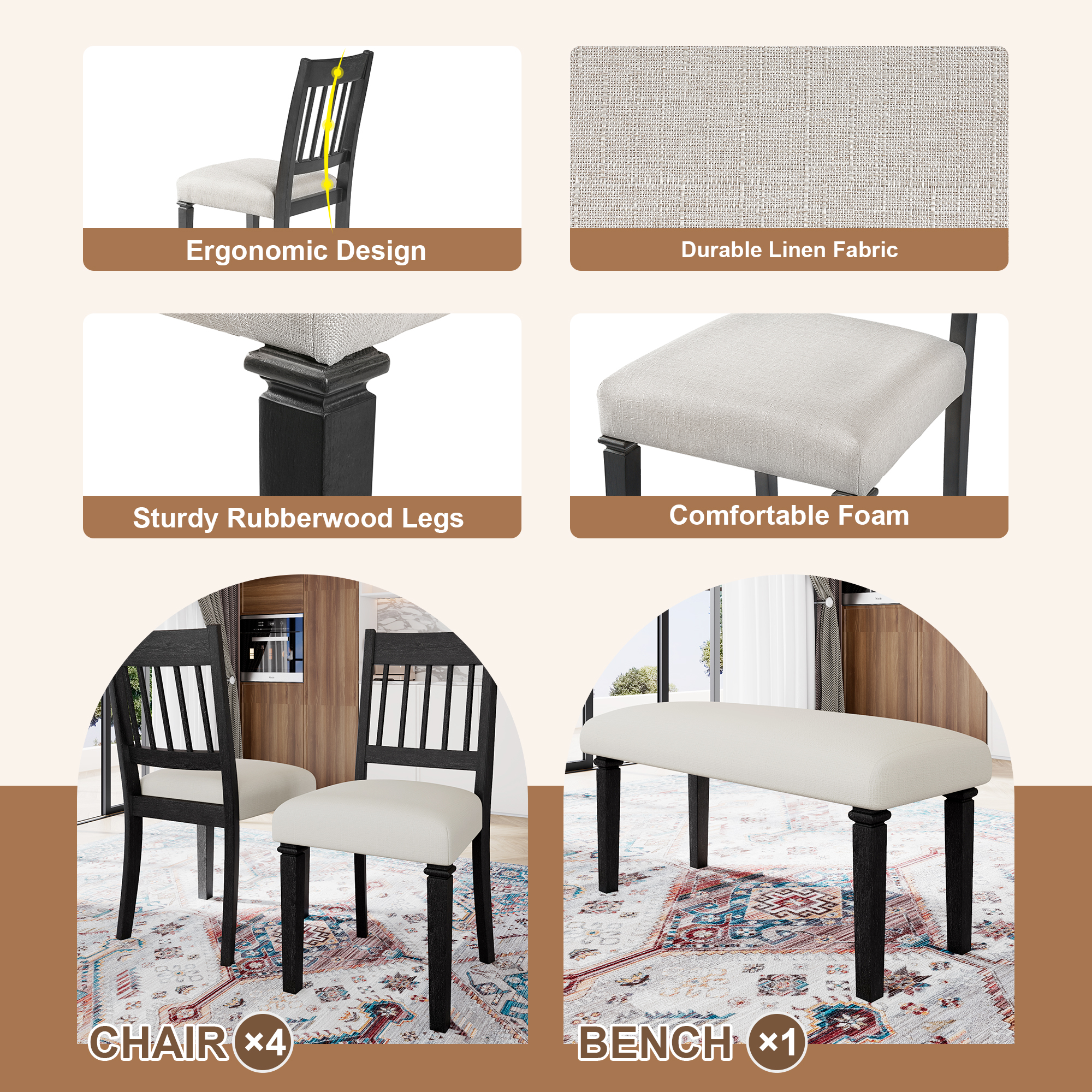 Includes a spacious dining table, four chairs, and a bench, offering ample seating for family and guests while enhancing the sense of togetherness.