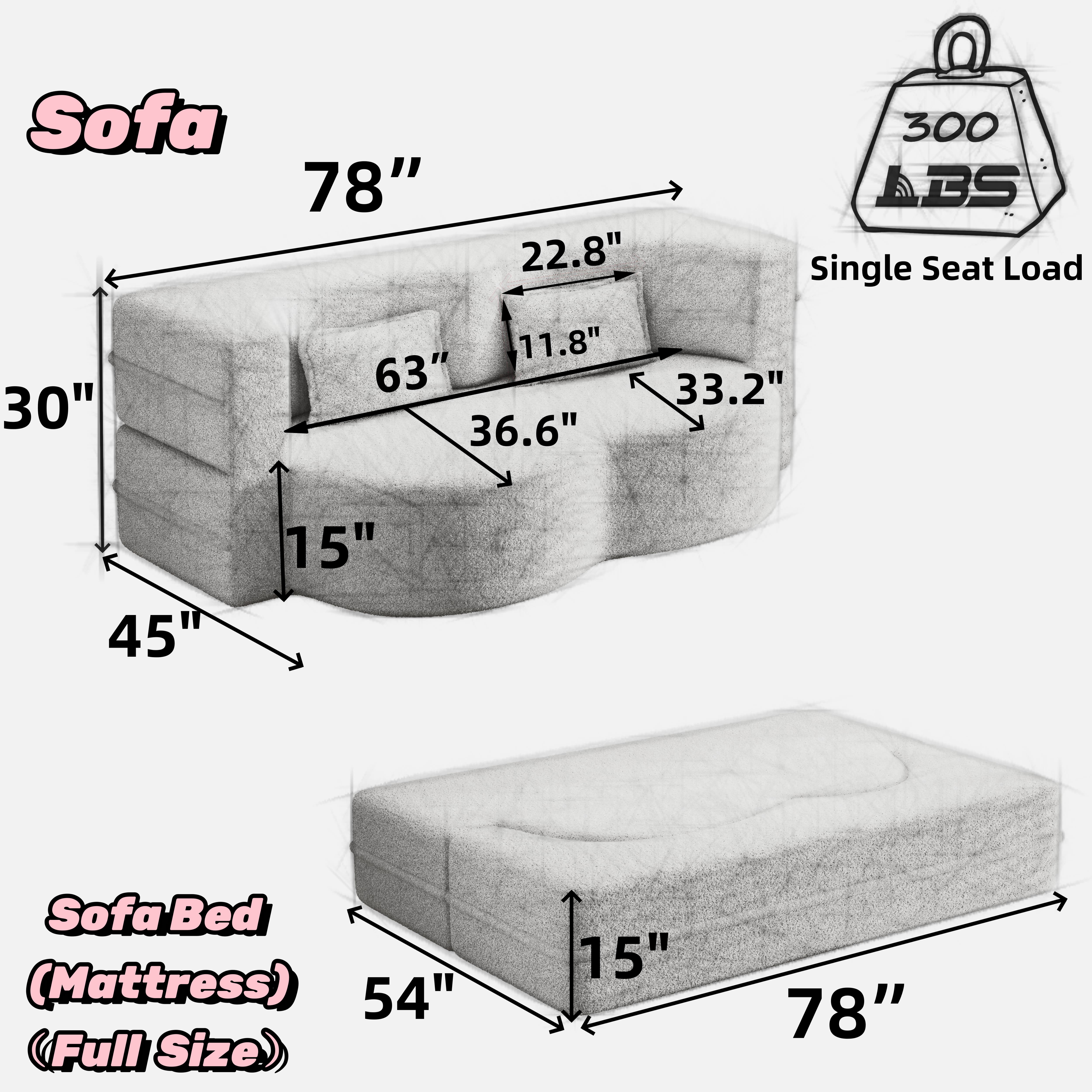 Convertible Design: Easily transforms from a floor sofa into a full-size sleeper bed (78″ x 54″) for convenient sleeping arrangements.